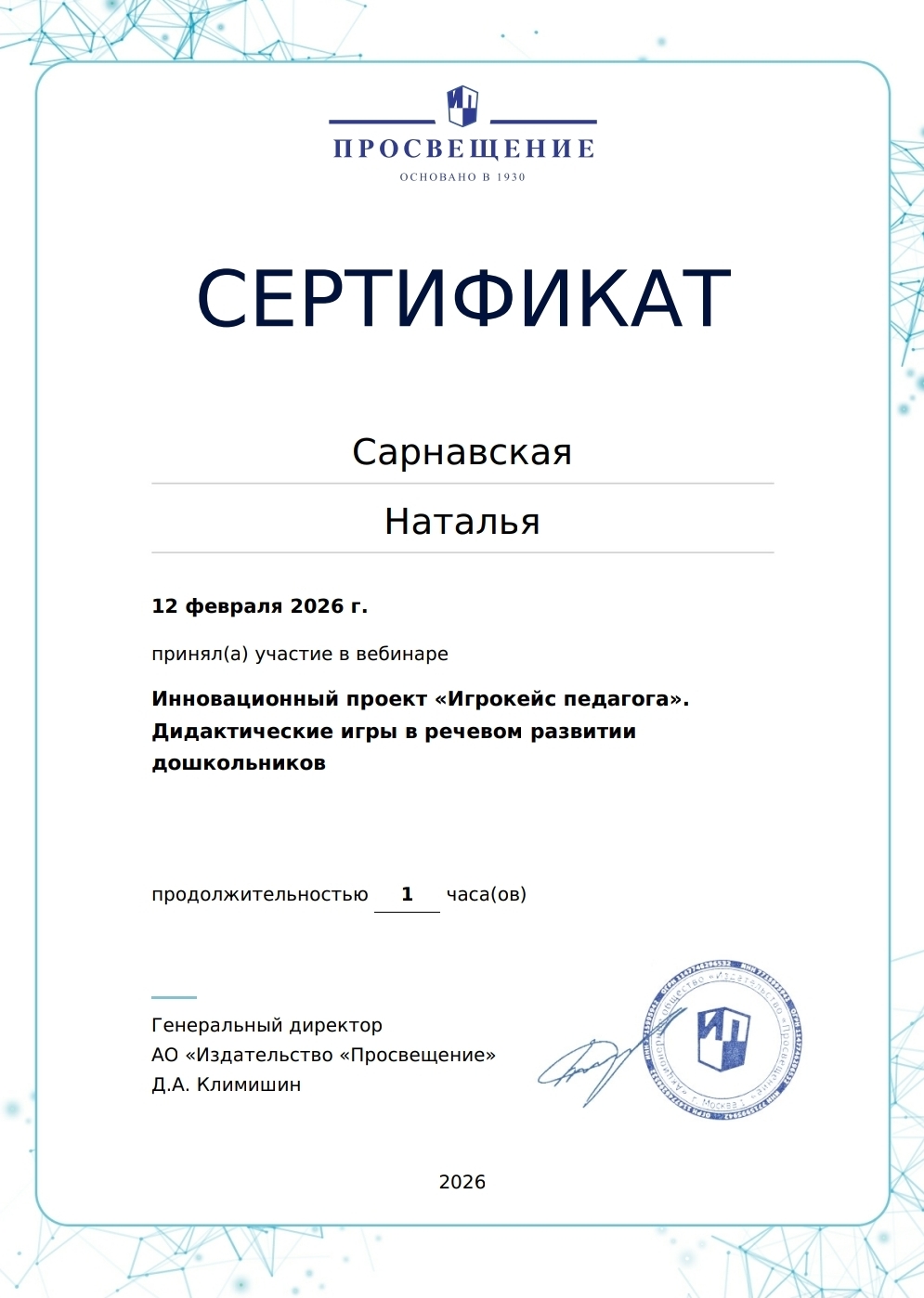 (АО Издательство Просвещение . 0,5часов. Форма обучения: Вебинар. Направленность: иное).